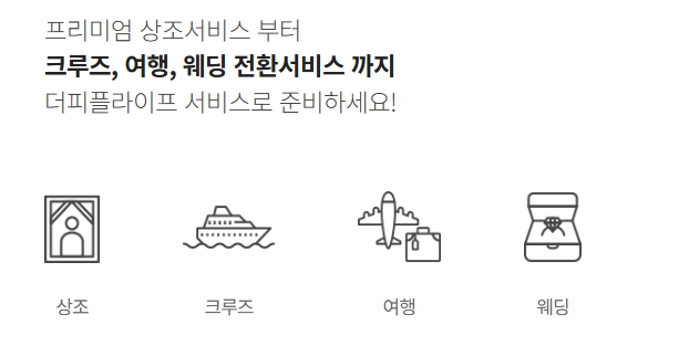장례 상품을 비롯해 웨딩, 크루즈, 펫 서비스 등 생애 주기에 맞춘 다채로운 프로그램들이 일목요연하게 정리되어 있어 사용자가 목적에 따라 원하는 서비스를 쉽게 탐색할 수 있도록 되어 있습니다.