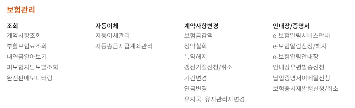 계약사항 조회, 예상 조회, 보험청약 조회, 보험증서 재발행 등의 서비스를 통해 현재 보유한 보험의 상태를 확인하고 필요한 조치를 취할 수 있습니다.