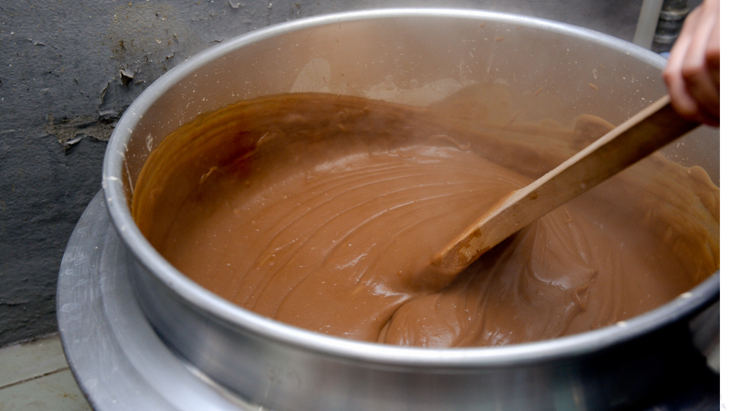 약불로 가열하며 계속 저어주면 점차 농도가 짙어지고, 갈색빛이 도는 묵 상태로 변하게 됩니다.
