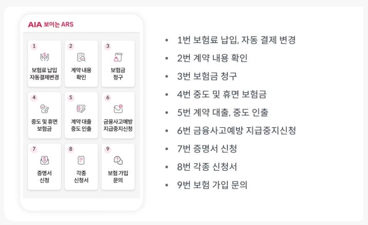 AIA생명보험의 ARS 자동화 서비스는 고객이 원하는 서비스를 신속하게 이용할 수 있도록 다양한 메뉴를 제공합니다.
