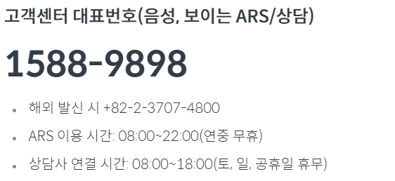 대표 전화번호는 1588-9898이며, 해외에서 이용하실 경우 +82-2-3707-4800으로 연락하시면 됩니다.
