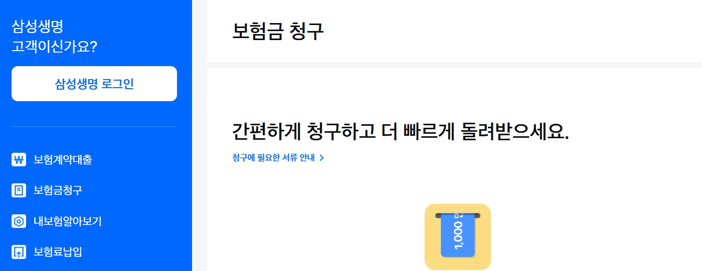 또한 삼성생명 공식 홈페이지에서도 보험금 청구가 가능합니다. 홈페이지에 접속해 ‘보험금 청구’ 메뉴를 선택하고, 본인 인증 절차를 거쳐 서류를 제출하면 됩니다.