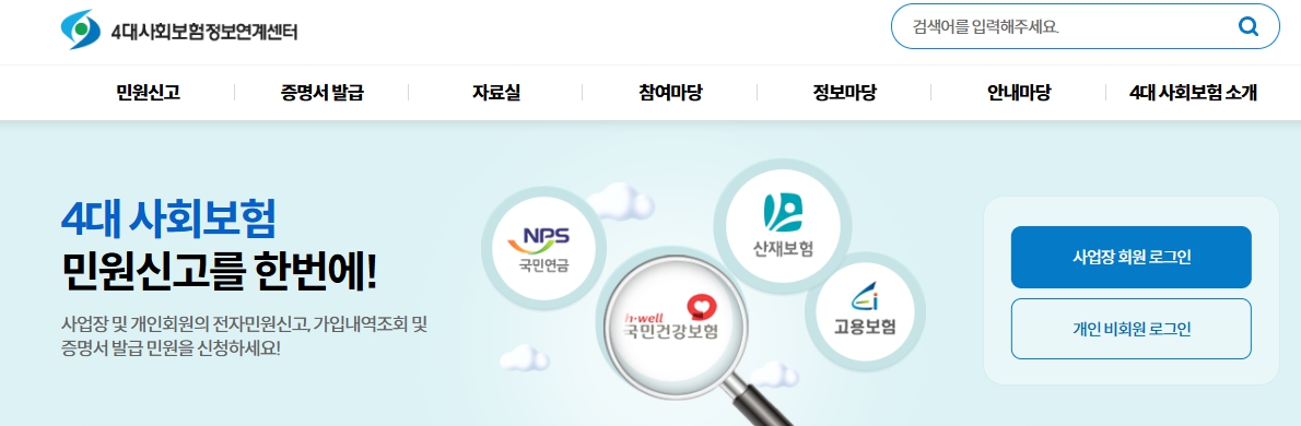 4대사회보험 정보연계센터는 국민연금, 건강보험, 고용보험, 산재보험 등 4대 사회보험과 관련된 민원 업무를 통합적으로 처리할 수 있는 온라인 포털입니다.