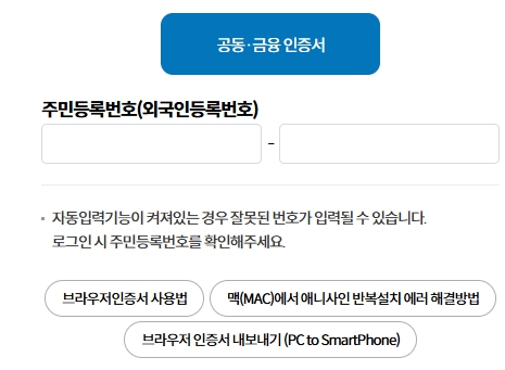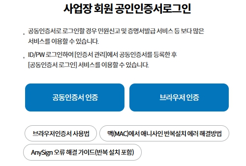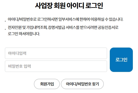 사업장은 사업자등록번호로, 개인은 주민등록번호로 회원가입을 진행할 수 있습니다. 회원가입 후에는 공동인증서를 등록하여야만 서비스 이용이 가능합니다.