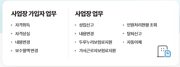 이 센터를 통해 사업장과 개인은 각종 자격 취득 및 상실 신고, 보수 변경, 사업장 성립 및 탈퇴 신고 등 다양한 업무를 한 곳에서 처리할 수 있습니다.