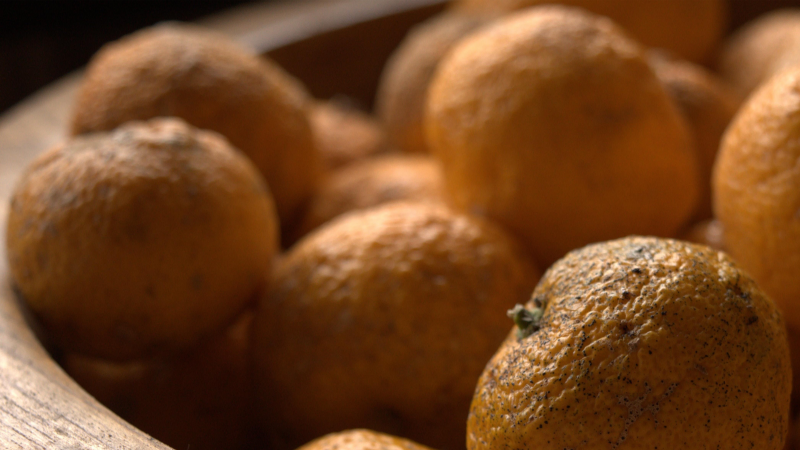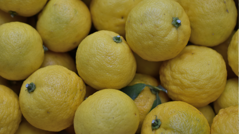 신선한 유자를 베이킹소다와 식초를 섞은 물에 깨끗이 씻고, 물기를 완전히 제거합니다.