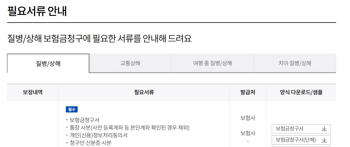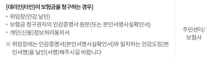 또한, 보험금을 받을 계좌 확인을 위해 통장 사본이 필요하며, 사전에 계좌가 등록된 경우에는 생략할 수 있습니다.