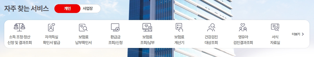 개인 민원 서비스로는 건강보험 자격 확인, 보험료 조회 및 납부, 각종 증명서 발급, 건강검진 예약 및 결과 확인 등을 포함하고 있습니다.